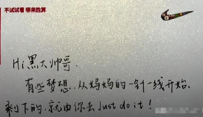 给男孩的信上写着:“嘿,黑大帅哥,有些梦想,从妈妈的一针一线开始。剩下的,就由你just do it!”